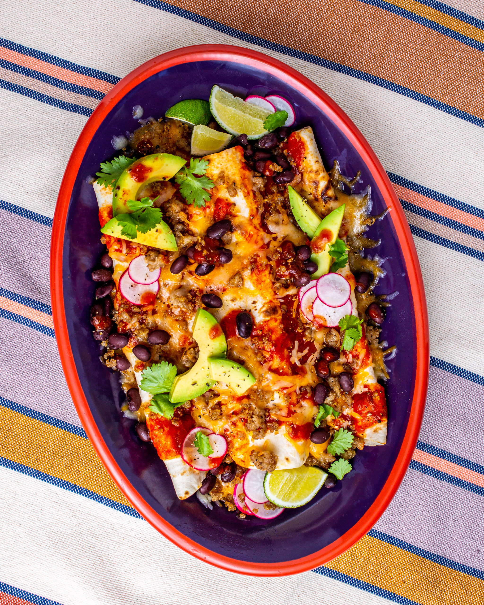Organize each of the enchilada ingredients into an easy assembly line in this order: sauce, ground pork, black beans, and cheese. You’re about to get your hands a little messy, so it’s nice to line these ingredients up close together!